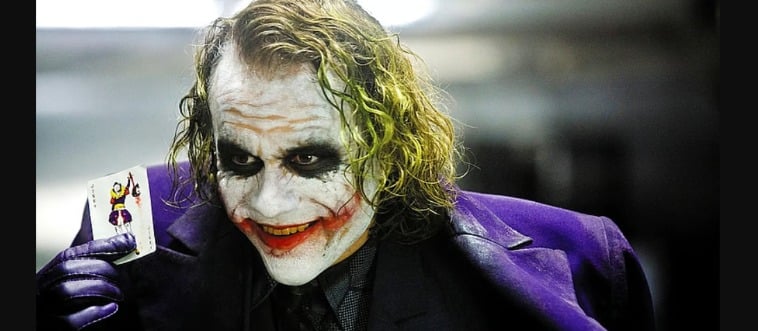 Heath Ledger como o Coringa com terno roxo, cabelo verde e sorriso cicatrizado. Qual filme apresenta este vilão?